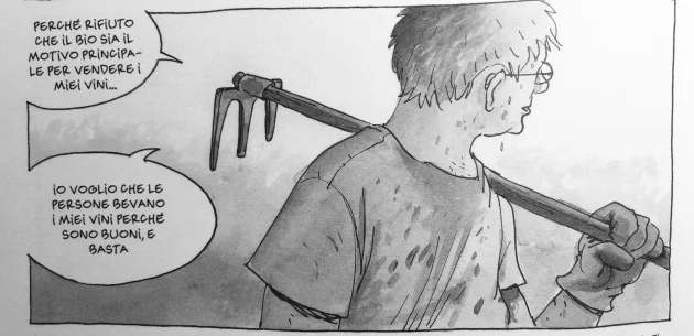 L’idea è semplice e, al tempo stesso, ingegnosa: scegliere un amico vignaiolo – Richard Leroy – e vivere con lui a stretto contatto per un anno, raccontando il complesso mondo del vino (e del fumetto) in diciannove mosse e facendo emergere le numerose analogie esistenti tra vini e libri nel corso di un’educazione sentimentale reciproca. Grazie alla potenza espressiva dell’immagine, l’autore riesce a toccare con leggerezza e ironia non solo la maggior parte degli argomenti agronomici (potatura, diserbo meccanico, trattamenti, potatura verde, vendemmia) e delle pratiche di cantina (scelta dei legni, fermentazione alcolica e malolattica, solfitazione, colmatura, travaso, imbottigliamento), ma anche questioni apparentemente marginali, quali le certificazioni biologiche, il rifiuto di essere etichettati, la veridicità della teoria biodinamica, la seccatura arrecata dalla gestione delle vendite e il difficile rapporto con la burocrazia, l’importanza della politica, il rifiuto delle denominazioni in nome della massima libertà espressiva.